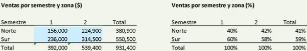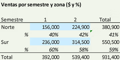 Existen distintas situaciones en las que esta regla se vuelve muy útil. A modo de ejemplo, seleccionamos éste, donde se resumen los montos de las ventas por semestre y zona en $: